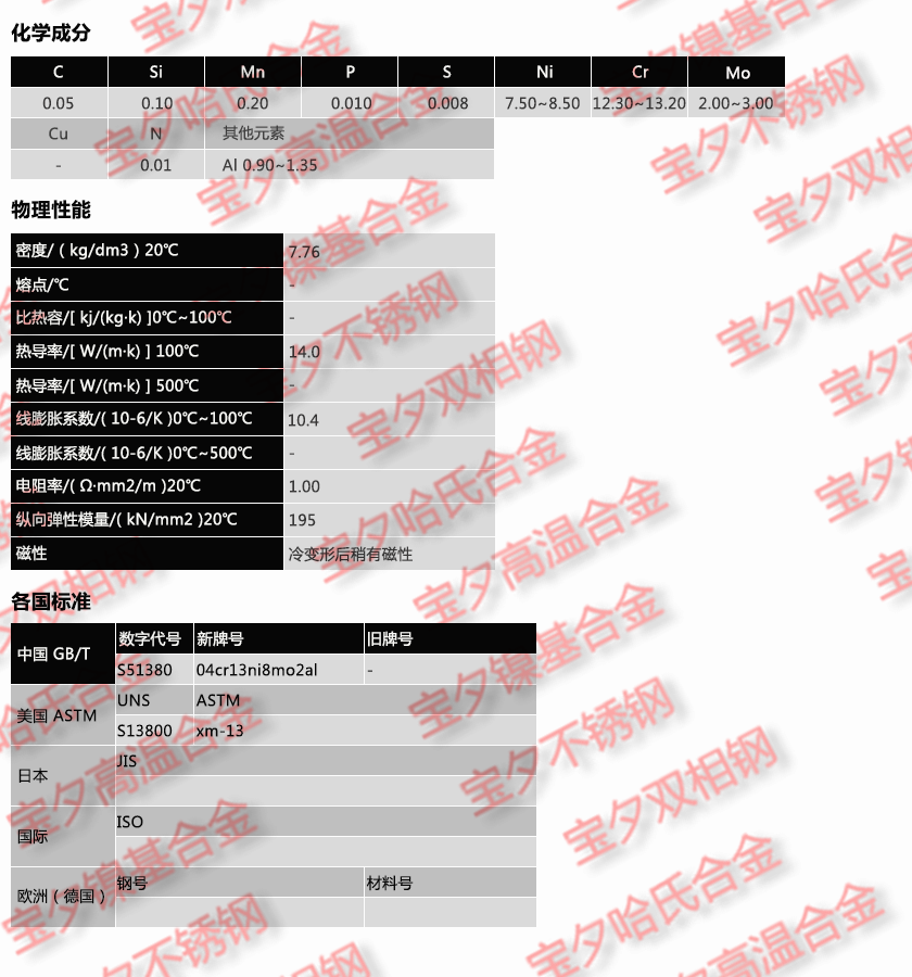 宝钢04Cr13Ni8Mo2Al,太钢04Cr13Ni8Mo2Al,新日铁04Cr13Ni8Mo2Al,日本冶金04Cr13Ni8Mo2Al,蒂森克虏伯04Cr13Ni8Mo2Al,奥托昆普04Cr13Ni8Mo2Al,日本神户04Cr13Ni8Mo2Al